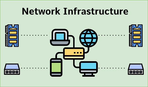 Definition and components of network infrastructure.Star, Ring, Bus, Mesh, and Hybrid.Routers, switches, hubs, bridges, repeaters
